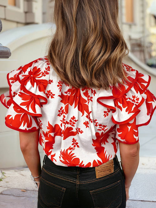 Floral Print Tiered Ruffled Sleeve V Neck Blouse